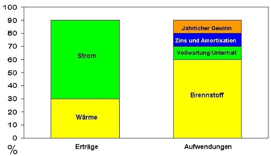 Unten: Die qualitative Gegenüberstellung der Aufwände und Erträge, die charakteristisch für eine BHKW-Anlage sind.